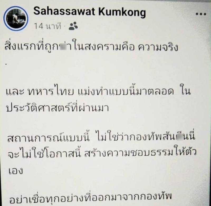 วานนี้ (28 ก.ค. 2568) นายสหัสวัต คุ้มคง สส.ชลบุรี พรรคประชาชน ได้โพสข้อความผ่านเฟซบุ๊ก ระบุว่า สิ่งแรกที่ถูกx่าในสงครามคือ ความจริง และทหารไทย แม่งทำแบบนี้มาตลอด ในประวัติศาสตร์ที่ผ่านมา สถานการณ์แบบนี้ ไม่ใช่ว่ากองทัพส้นxีนนี่ จะไม่ใช้โอกาสนี้ สร้างความชอบธรรมให้ตัวเอง อย่าเชื่อทุกอย่างที่ออกจากกองทัพ