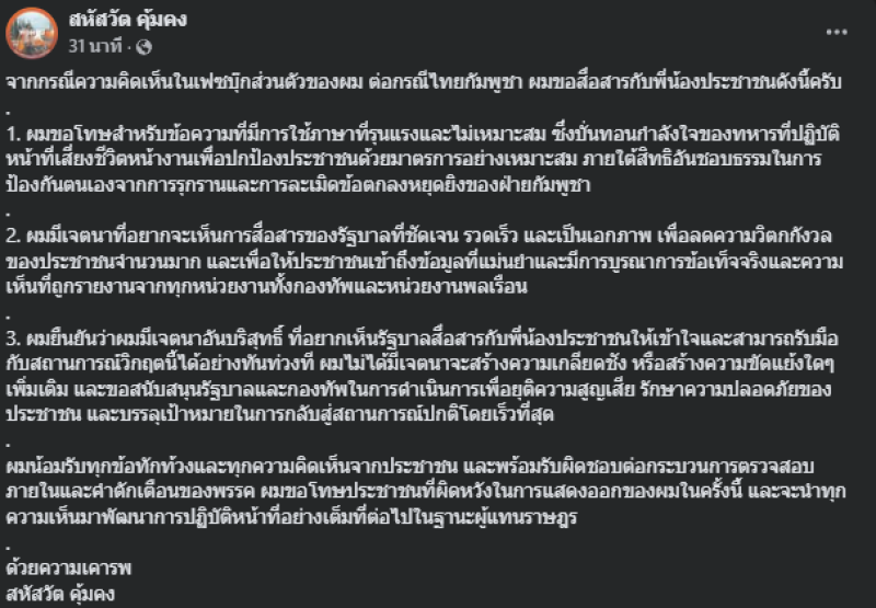1. ผมขอโทษสำหรับข้อความที่มีการใช้ภาษาที่รุนแรงและไม่เหมาะสม ซึ่งบั่นทอนกำลังใจของทหารที่ปฏิบัติหน้าที่เสี่ยงชีวิตหน้างานเพื่อปกป้องประชาชนด้วยมาตรการอย่างเหมาะสม ภายใต้สิทธิอันชอบธรรมในการป้องกันตนเองจากการรุกรานและการละเมิดข้อตกลงหยุดยิงของฝ่ายกัมพูชา