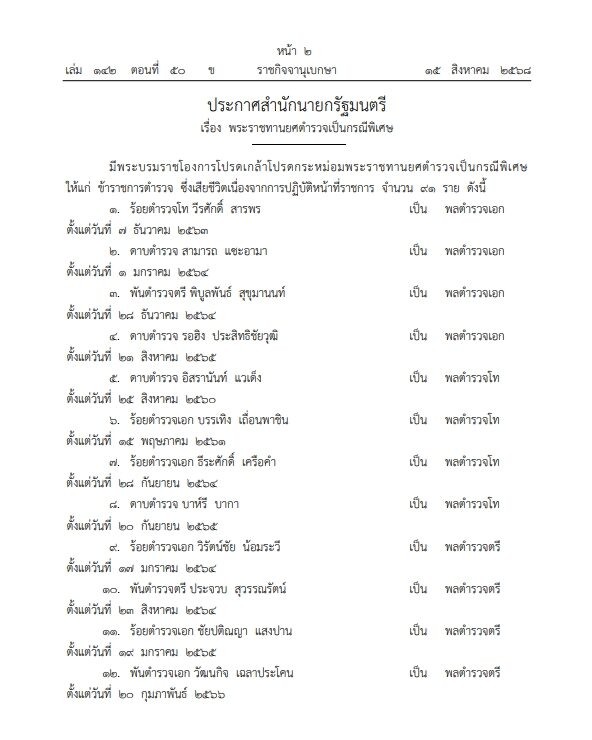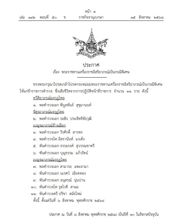 ทรงพระกรุณาโปรดเกล้าโปรดกระหม่อมพระราชทานเครื่องราชอิสริยาภรณ์เป็นกรณีพิเศษ ให้แก่ข้าราชการตำรวจ ซึ่งเสียชีวิตจากการปฏิบัติหน้าที่ราชการ จำนวน 11 ราย ดังนี้