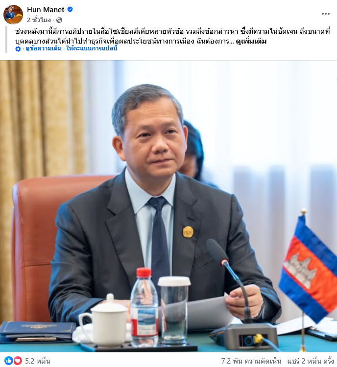 ล่าสุด วันที่ 9 กันยายน 2568 ฮุน มาเนต นายกรัฐมนตรีกัมพูชา ได้ออกมาโพสต์รูปภาพพร้อมข้อความเพื่อชี้เเจงต่อประเด็นร้อนดังกล่าว ผ่านเฟซบุ๊กส่วนตัว Hun Manet โดยระบุว่า ช่วงหลังมานี้มีการอภิปรายในสื่อโซเชียลมีเดียหลายหัวข้อ รวมถึงข้อกล่าวหา ซึ่งมีความไม่ชัดเจน ถึงขนาดที่บุคคลบางส่วนได้นําไปทําธุรกิจเพื่อผลประโยชน์ทางการเมือง ฉันต้องการที่จะใช้โอกาสในการรัฐสั้น ๆ ทําไมรัฐบาลเงียบจัง บางคนอาจเข้าใจว่า จนกว่านายกรัฐมนตรี หรือคนสําคัญจะออกอากาศข้อความทางโทรทัศน์ หรือเครือข่ายสังคมเป็นประจํา คิดว่ารัฐบาลเงียบ