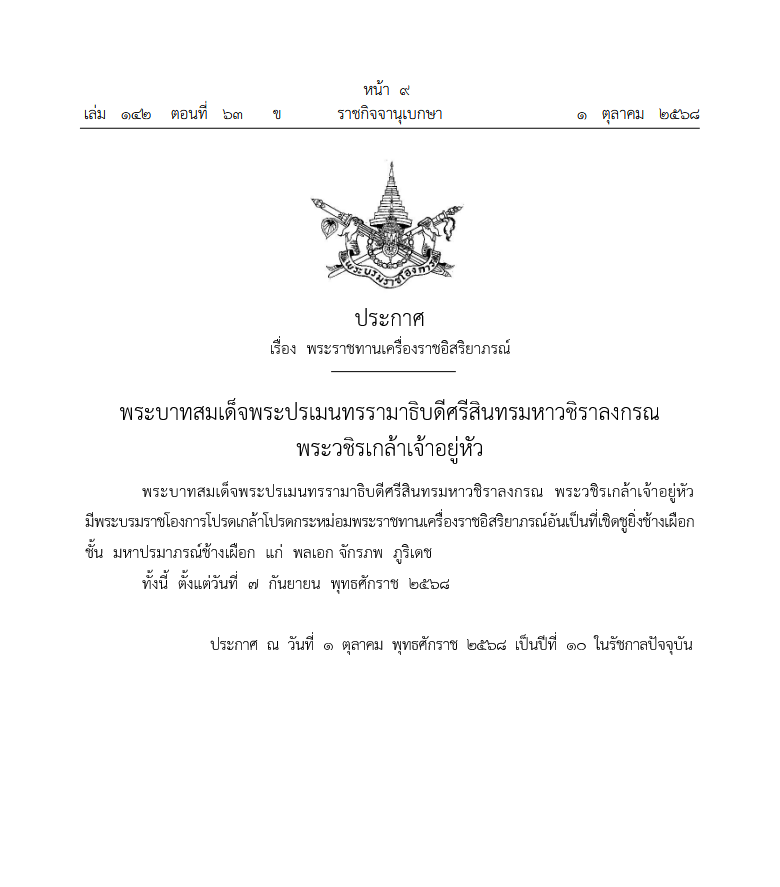 เมื่อวันที่ 1 ตุลาคม 2568 ที่ผ่านมา เว็บไซต์ ราชกิจจานุเบกษา เผยเเพร่ประกาศ เรื่อง พระราชทานเครื่องราชอิสริยาภรณ์ พระบาทสมเด็จพระปรเมนทรรามาธิบดีศรีสินทรมหาวชิราลงกรณ พระวชิรเกล้าเจ้าอยู่หัว