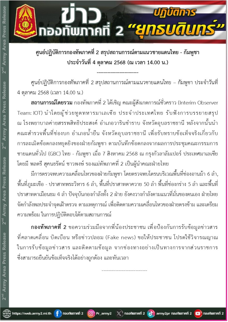 เมื่อวันที่ 4 ตุลาคม 2568 ศูนย์ปฏิบัติการกองทัพภาคที่ 2 ได้เผยเเพร่ข้อมูล สรุปสถานการณ์ตามแนวชายแดนไทย-กัมพูชา ตามปฏิบัติการยุทธบดินทร์ ประจำวันที่ 4 ตุลาคม 2568 (ณ เวลา 14.00 น.) ผ่านเพจเฟซบุ๊ก กองทัพภาคที่ 2 โดยระบุว่า สถานการณ์โดยรวม กองทัพภาคที่ 2 ได้เชิญ คณะผู้สังเกตการณ์ชั่วคราว (Interim Observer Team: IOT) นำโดยผู้ช่วยทูตทหารมาเลเซีย ประจำประเทศไทย รับฟังการบรรยายสรุป ณ โรงพยาบาลค่ายสรรพสิทธิประสงค์ อำเภอวารินชำราบ จังหวัดอุบลราชธานี