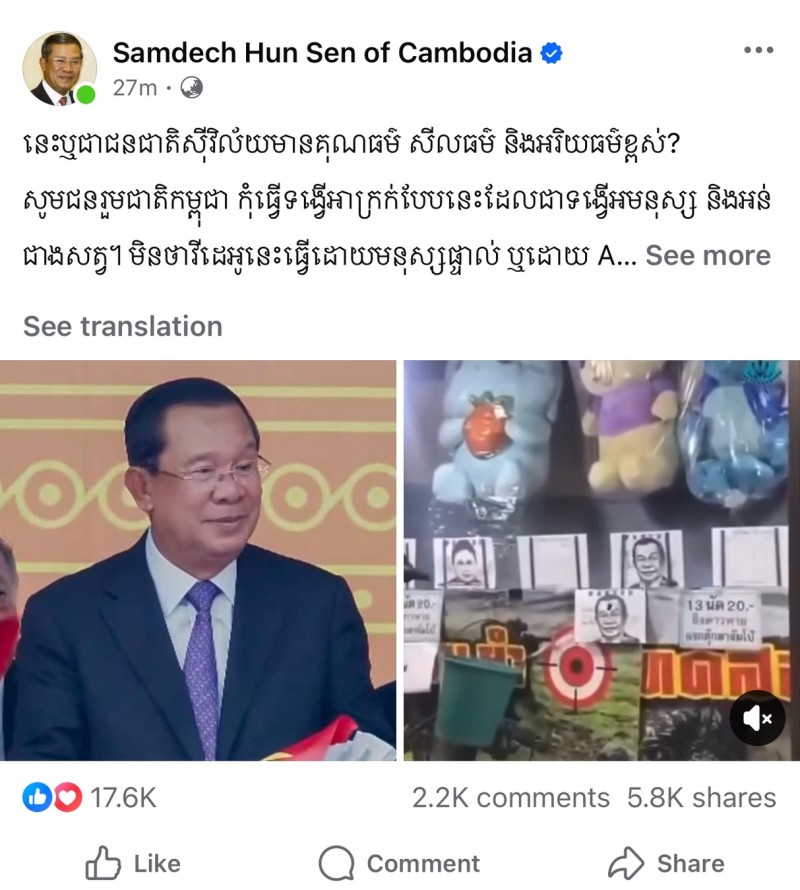 เมื่อวันที่ 6 ตุลาคม 2568 สมเด็จฮุน เซน ประธานวุฒิสภากัมพูชา ได้โพสต์รูปภาพของตนเอง พร้อกับคลิปวิดีโอ ที่เป็นเนื้อหาคล้ายกับงานกาชาด และมีภาพเจ้าหน้าที่กำลังเล่นสนุกอยู่ภายในร้ายยิงปืนลม ผ่านเฟซบุ๊ก Samdech Hun Sen of Cambodia โดยระบุว่า นี่หรือคือความเป็นอารยชนที่มีคุณธรรม ศีลธรรม และวัฒนธรรมสูง