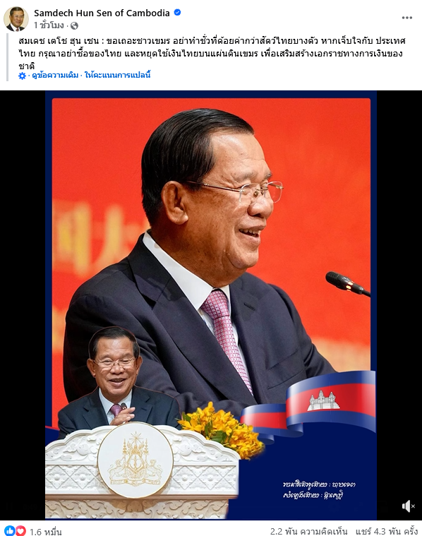 ล่าสุด ฮุน เซน ได้เคลื่อนไหวอีกครั้ง โดยการโพสต์คลิปวิดีโอ พร้อมกับข้อความ โดยระบุว่า ขอเถอะชาวเขมร อย่าทําชั่วที่ด้อยค่ากว่าสัตว์ไทยบางตัว หากเจ็บใจกับ ประเทศไทย กรุณาอย่าซื้อของไทย และหยุดใช้เงินไทยบนแผ่นดินเขมร เพื่อเสริมสร้างเอกราชทางการเงินของชาติ