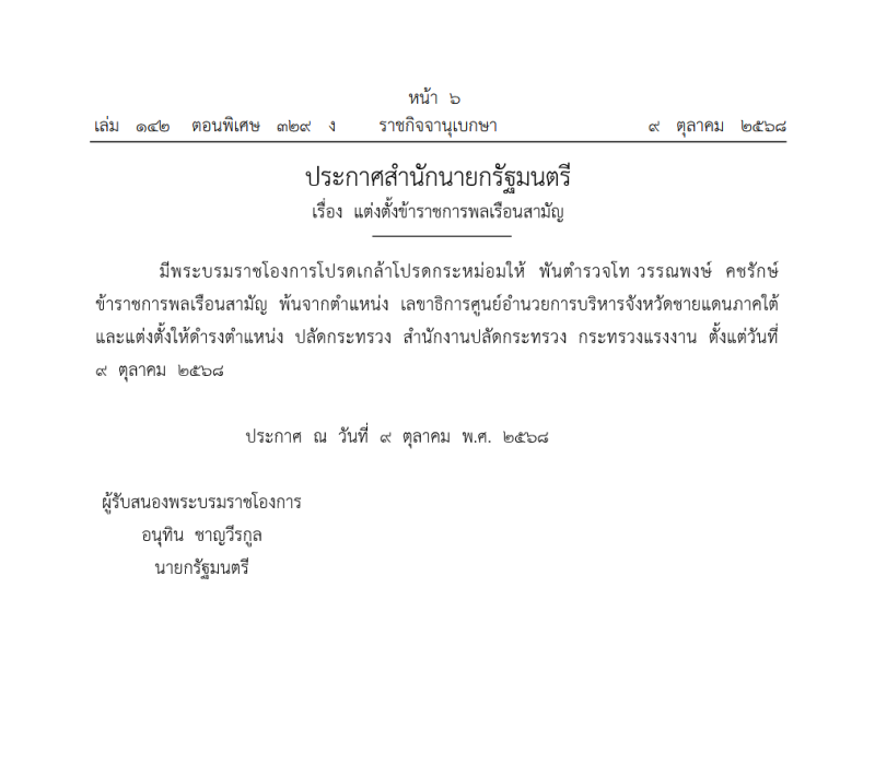 เมื่อวันที่ 9 ตุลาคม 2568 ที่ผ่านมา เว็บไซต์ ราชกิจจานุเบกษา เผยเเพร่ประกาศสำนักนายกรัฐมนตรี เรื่อง แต่งตั้งข้าราชการพลเรือนสามัญ โดยระบุว่า มีพระบรมราชโองการโปรดเกล้าโปรดกระหม่อมให้ พันตำรวจโท วรรณพงษ์ คชรักษ์ ข้าราชการพลเรือนสามัญ พ้นจากตำแหน่ง เลขาธิการศูนย์อำนวยการบริหารจังหวัดชายแดนภาคใต้ และแต่งตั้งให้ดำรงตำแหน่ง ปลัดกระทรวง สำนักงกงานปลัดกระทรวง กระทรวงแรงงาน ตั้งแต่วันที่ 9 ตุลาคม 2568