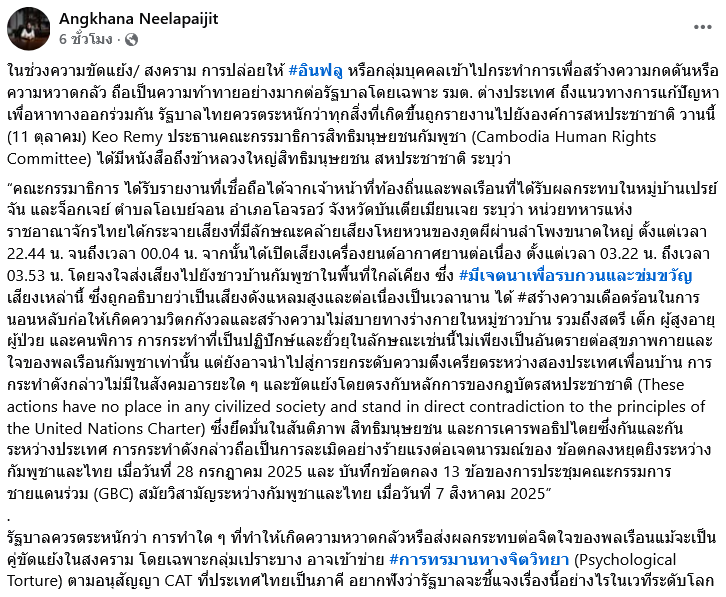 รัฐบาลไทยควรตระหนักว่าทุกสิ่งที่เกิดขึ้น ถูกรายงานไปยังองค์การสหประชาชาติ วานนี้ (11 ตุลาคม) Keo Remy ประธานคณะกรรมาธิการสิทธิมนุษยชนกัมพูชา (Cambodia Human Rights Committee) ได้มีหนังสือถึงข้าหลวงใหญ่สิทธิมนุษยชน สหประชาชาติ ระบุว่า คณะกรรมาธิการ ได้รับรายงานที่เชื่อถือได้จากเจ้าหน้าที่ท้องถิ่นและพลเรือนที่ได้รับผลกระทบในหมู่บ้านเปรย์จัน และจ็อกเจย์ ตำบลโอเบย์จอน อำเภอโอจรอว์ จังหวัดบันเตียเมียนเจย ระบุว่า หน่วยทหารแห่งราชอาณาจักรไทยได้กระจายเสียงที่มีลักษณะคล้ายเสียงโหยหวนของภูตผีผ่านลำโพงขนาดใหญ่ ตั้งแต่เวลา 22.44 น. จนถึงเวลา 00.04 น.