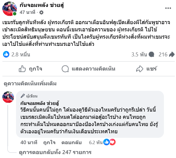 พร้อมทั้งระบุเพิ่มในคอมเมนต์ใต้โพสต์ดังกล่าวว่า วิธีคนนั้นคนนี้ไม่ถูก ได้มองดูวิธีตัวเองไหมครับว่าถูกรึเปล่า วันนี้เขมรละเมิดเต็มไปหมดได้ออกมาต่อสู้อะไรบ้าง คนไทยถูกกระทำเต็มไปหมดออกมาป้องป้องใครบ้างเก่งแต่กับคนไทย ยังรู้ตัวเองอยู่ไหมครับว่ากินเงินเดือนประเทศไทย
