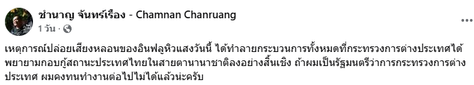 นายชำนาญ ระบุว่า เหตุการณ์ที่อินฟลูเอนเซอร์รายดังกล่าวปล่อยเสียงหลอนในวันนี้ ถือเป็นการกระทำที่ส่งผลกระทบต่อภาพลักษณ์ของประเทศอย่างรุนแรง และได้ทำลายกระบวนการทั้งหมดที่กระทรวงการต่างประเทศพยายามกอบกู้สถานะของประเทศไทยในสายตานานาชาติลงอย่างสิ้นเชิง