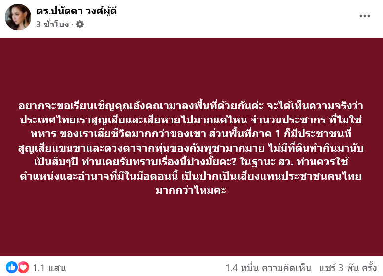 ส่วนพื้นที่ภาค 1 ก็มีประชาชนที่สูญเสียแขนขาและดวงตาจากทุ่นของกัมพูชามากมาย ไม่มีที่ดินทำกินมานับเป็นสิบ ๆ ปี ท่านเคยรับทราบเรื่องนี้บ้างมั้ยคะ ในฐานะ สว. ท่านควรใช้ตำแหน่งและอำนาจที่มีในมือตอนนี้ เป็นปากเป็นเสียงแทนประชาชนคนไทยมากกว่าไหมคะ