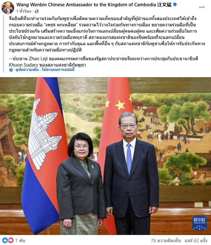 เมื่อวันที่ 15 ตุลาคม 2568 หวัง เหวินปิน (Wang Wenbin) เอกอัครราชทูตจีนประจำกัมพูชา ได้โพสต์รูปภาพพร้อมข้อความ ผ่านทางเฟซบุ๊กส่วนตัว Wang Wenbin Chinese Ambassador to the Kingdom of Cambodia 汪文斌 โดยระบุว่า จีนยินดีที่จะทํางานร่วมกับกัมพูชาเพื่อติดตามความเห็นชอบสําคัญที่ผู้นําของทั้งสองประเทศได้เข้าถึงกรอบความร่วมมือ เพชรหกเหลี่ยม
