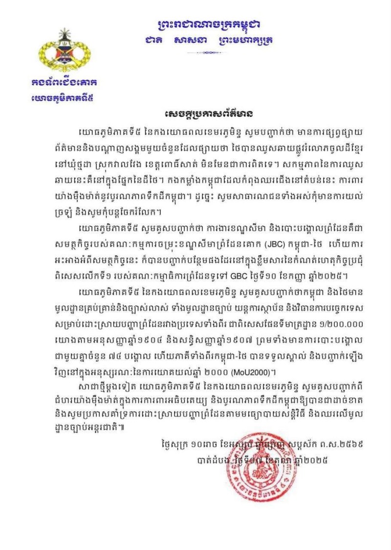 กองทัพภาคที่ 5 ของกองทัพกัมพูชาขอเน้นย้ำจุดยืนที่มั่นคงในการปกป้องอธิปไตยและบูรณภาพแห่งดินแดนของกัมพูชาอย่างสมบูรณ์อีกครั้ง และขอประกาศการสนับสนุนการแก้ไขปัญหาชายแดนด้วยสันติวิธีและตามกฎหมายระหว่างประเทศ