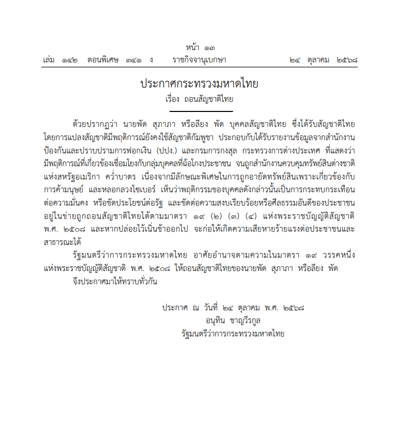 เมื่อวันที่ 24 ตุลาคม 2568 เว็บไซต์ราชกิจจานุเบกษา เผยแพร่ประกาศกระทรวงมหาดไทย ที่ลงนามโดย นายอนุทิน ชาญวีรกูล รัฐมนตรีว่าการกระทรวงมหาดไทย เรื่องถอนสัญชาติไทย ระบุว่า ประกาศกระทรวงมหาดไทย เรื่อง ถอนสัญชาติไทย