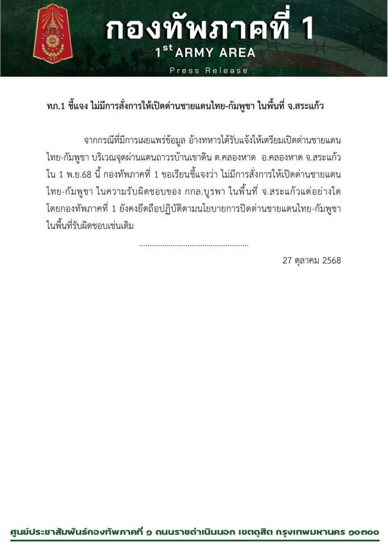 กองทัพภาคที่ 1 ขอเรียนชี้แจงว่า ไม่มีการสั่งการให้เปิดด่านชายแดนไทย-กัมพูชา ในความรับผิดชอบของ กกล.บูรพา ในพื้นที่ จ.สระแก้วแต่อย่างใด โดยกองทัพภาคที่ 1 ยังคงยึดถือปฏิบัติตามนโยบายการปิดด่านชายแดนไทย-กัมพูชา ในพื้นที่รับผิดชอบเช่นเดิม 27 ตุลาคม 2568