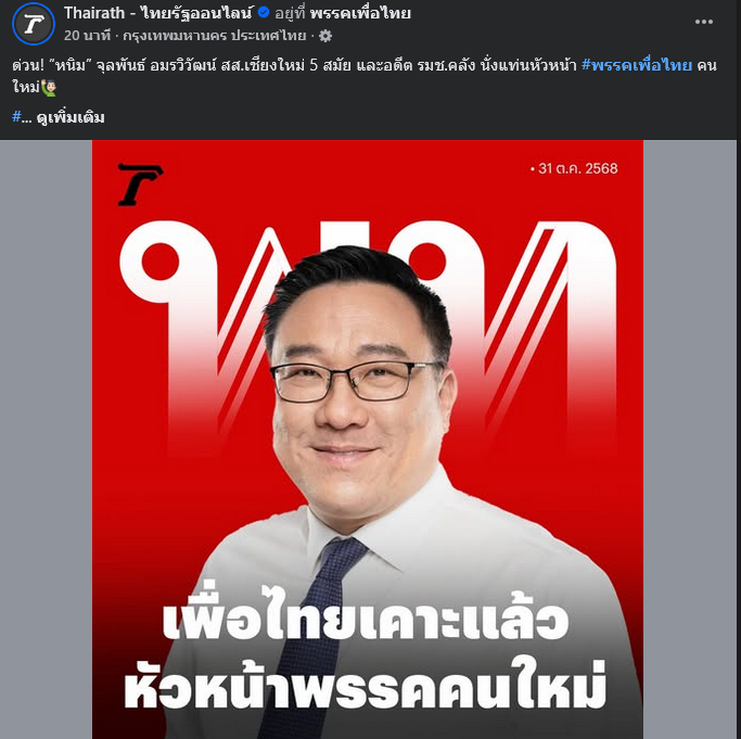 วันที่ 31 ตุลาคม 2568 มีรายงานว่า ในวันนี้ พรรคเพื่อไทยจะคัดเลือกหัวหน้าพรรคเพื่อไทยคนใหม่ ภายหลัง น.ส.แพทองธาร ชินวัตร หัวหน้าพรรคเพื่อไทย ได้ทำหนังสือขอลาออกจากการเป็นหัวหน้าพรรค โดยให้เหตุผลต้องการยกเครื่องใหม่ เพื่อเปลี่ยนโครงสร้าง และกระบวนการคิดใหม่ เพื่อให้พรรคสามารถชนะเลือกตั้ง