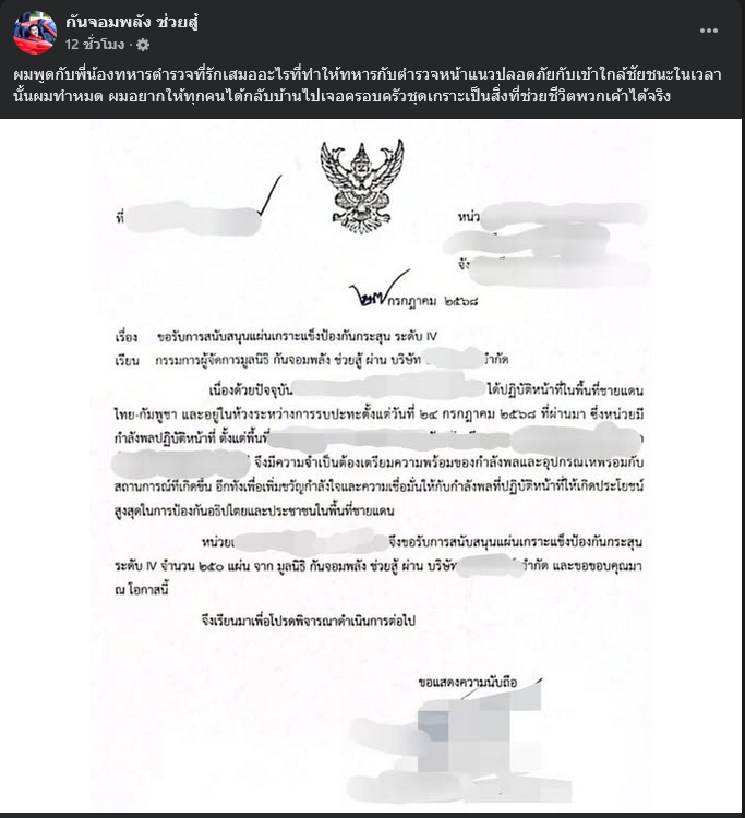 จากกรณีที่ก่อนหน้านี้ เพจเฟซบุ๊ก กันจอมพลัง ช่วยสู้ ได้มีการเผยแพร่เอกสารที่อ้างอิงว่าออกโดยหน่วยราชการลงวันที่ 27 ก.ค.2568 ขอรับการสนับสนุนแผ่นเกราะแข็ง ระดับ 4 (Level IV) จำนวน 250 แผ่น เพื่อเพิ่มขวัญกำลังใจและความเชื่อมั่นให้กับกำลังพลที่ปฏิบัติหน้าที่ในพื้นที่ชายแดนไทย-กัมพูชา