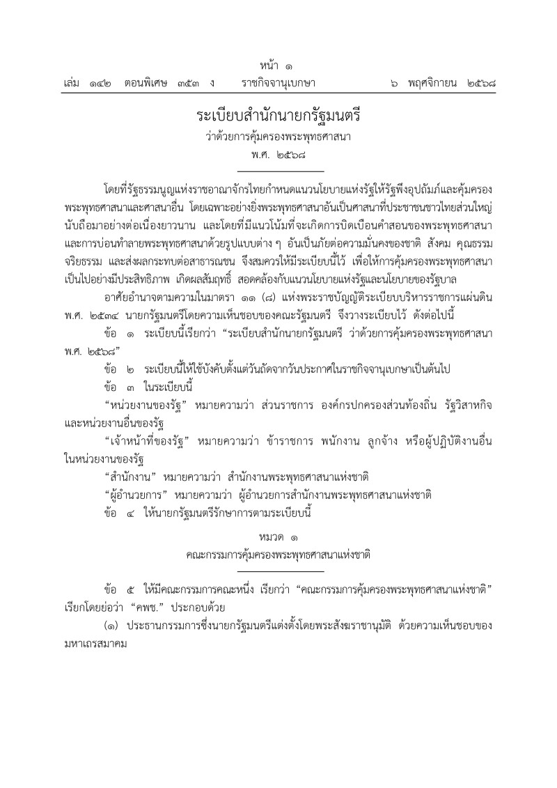 เมื่อวันที่ 6 พฤศจิกายน 2568 ที่ผ่านมา เว็บไซต์ ราชกิจจานุเบกษา เผยเเพร่ประกาศ ระเบียบสำนักนายกรัฐมนตรี ว่าด้วยการคุ้มครองพระพุทธศาสนา พ.ศ. 2568 โดยที่รัฐธรรมนูญแห่งราชอาณาจักรไทยกำหนดแนวนโยบายแห่งรัฐให้รัฐพึงอุปถัมภ์และคุ้มครอง พระพุทธศาสนาและศาสนาอื่น โดยเฉพาะอย่างยิ่งพระพุทธศาสนาอันเป็นศาสนาที่ประชาชนชาวไทยส่วนใหญ่ นับถือมาอย่างต่อเนื่องยาวนาน