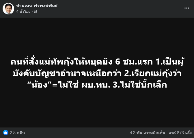 ล่าสุด วันที่ 10 พฤศจิกายน 2568 นายปานเทพ พัวพงษ์พันธ์ ประธานกรรมการมูลนิธิยามเฝ้าแผ่นดิน ได้ออกมาเคลื่อนไหวด้วยการโพสต์ข้อความ ผ่านเฟซบุ๊กส่วนตัว ปานเทพ พัวพงษ์พันธ์ โดยระบุว่า คนที่สั่งแม่ทัพกุ้งให้หยุดยิง 6 ชม. แรก