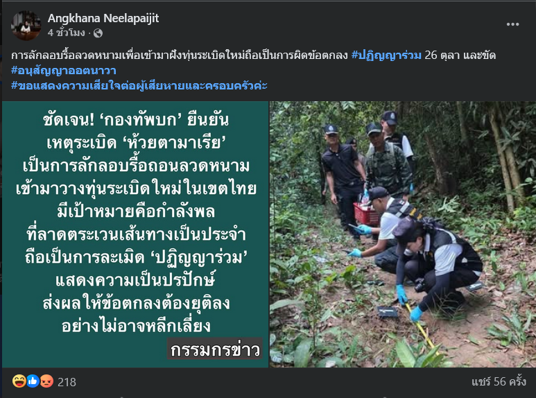 การลักลอบรื้อลวดหนามเพื่อเข้ามาฝังทุ่นระเบิดใหม่ถือเป็นการผิดข้อตกลง ปฏิญญาร่วม 26 ตุลา และขัด อนุสัญญาออตนาวา ขอแสดงความเสียใจต่อผู้เสียหายและครอบครัวค่ะ