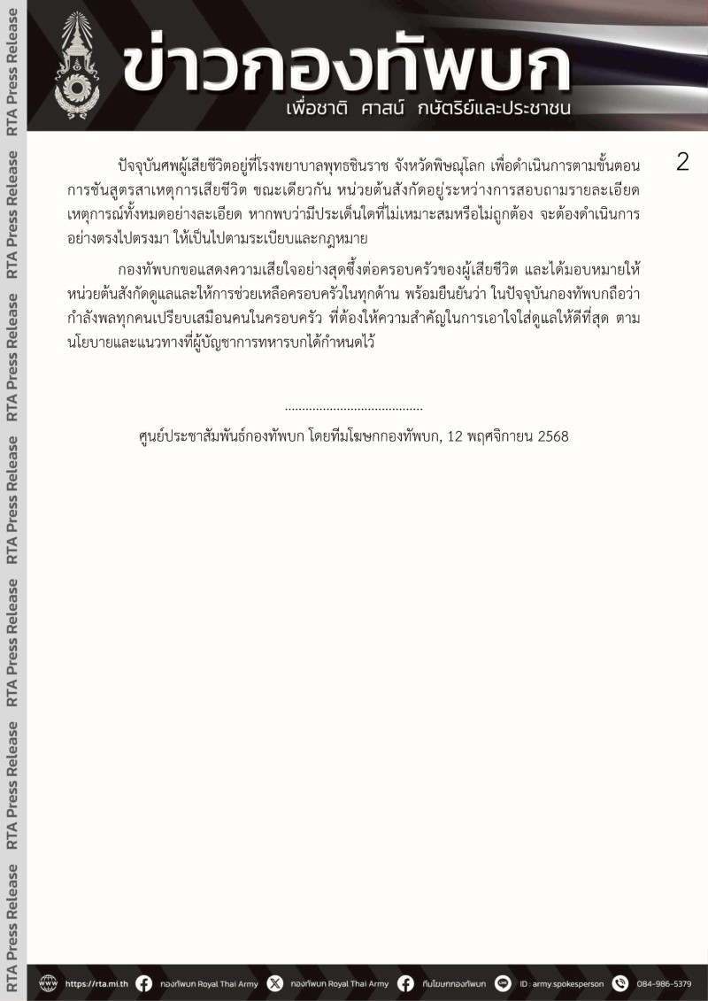 วันนี้ (12 พฤศจิกายน 2568) พลตรี วินธัย สุวารี โฆษกกองทัพบก เปิดเผยว่า เมื่อวันที่ 11 พฤศจิกายน 2568 เวลา 09.10 น. กองทัพบกได้รับรายงานเหตุ พลทหาร ราเชน ยวามื่อ ทหารกองประจำการผลัด 2/68 สังกัดหน่วยบัญชาการสงครามพิเศษ หน่วยฝึกกรมรบพิเศษที่ 4 กรมรบพิเศษที่ 4 จังหวัดพิษณุโลก ได้ผูกคอเสียชีวิตภายในห้องน้ำของห้องขังกองรักษาการณ์ โดยไม่มีร่องรอยการต่อสู้หรือถูกทำร้ายร่างกาย โดยมีผู้บังคับกองรักษาการณ์เป็นผู้ตรวจพบ