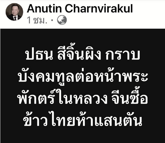 ต่อมา เวลา 13.25 น. นายอนุทิน ชาญวีรกุล นายกรัฐมนตรีไทย โพสต์เฟซบุ๊ก กล่าวว่า สี จิ้นผิง ประธานาธิบดีจีน กราบบังคมทูล ต่อหน้าพระพักตร์ในหลวง จีนซื้อข้าวไทย 5 แสนตัน