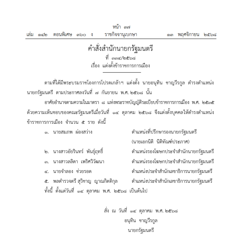 เมื่อวันที่ 14 พฤศจิกายน 2568 มีรายงานว่า เว็บไซต์ ราชกิจจานุเบกษา เผยเเพร่ ประกาศคำสั่งสำนักนายกรัฐมนตรี ที่ 334/2568 เรื่อง แต่งตั้งข้าราชการการเมือง ตามที่ได้มีพระบรมราชโองการโปรดเกล้าฯ แต่งตั้ง นายอนุทิน ชาญวีรกูล ดำรงตำแหน่งนายกรัฐมนตรี ตามประกาศลงวันที่ 7 กันยายน พ.ศ. 2568 นั้น
