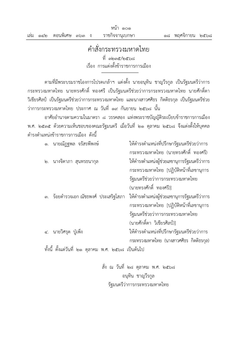 เมื่อวันที่ 19 พฤศจิกายน 2568 มีรายงานว่า เว็บไซต์ ราชกิจจานุเบกษา เผยเเพร่ ประกาศคำสั่งกระทรวงมหาดไทย ที่ 3235/2568 เรื่อง การแต่งตั้งข้าราชการการเมือง