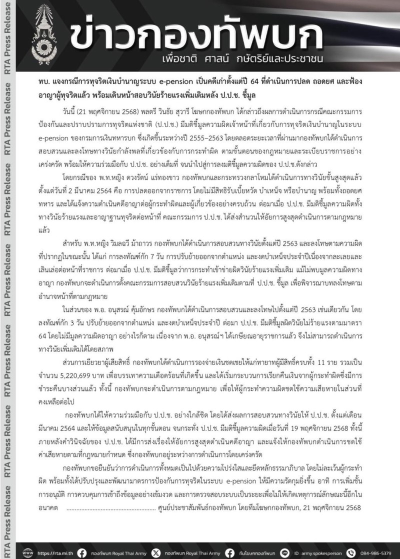 เมื่อวันที่ 21 พฤศจิกายน 2568 ที่ผ่านมา เพจเฟซบุ๊ก ทีมโฆษกกองทัพบก Army Spoke Team ได้โพสต์ชี้แจงกรณีการทุจริตเงินบำนาญระบบ e-pension ระบุว่า ทบ. แจงกรณีการทุจริตเงินบำนาญระบบ e-pension เป็นคดีเก่าตั้งแต่ปี 64 ที่ดำเนินการปลด ถอดยศ และฟ้องอาญาผู้ทุจริตแล้ว พร้อมเดินหน้าสอบวินัยร้ายแรงเพิ่มเติมหลัง ป.ป.ช. ชี้มูล