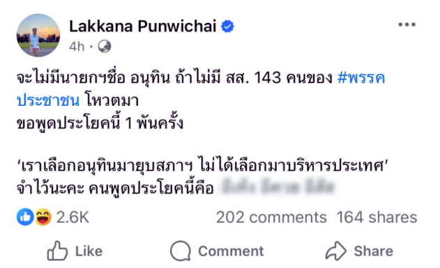 เมื่อวันที่ 25 พฤศจิกายน 2568 ที่ผ่านมา ลักขณา ปันวิชัย นักเขียนและพิธีกรชื่อดัง ได้ออกมาเคลื่อนไหวด้วยการโพสต์ข้อความผ่านเฟซบุ๊กส่วนตัว Lakkana Punwichai โดยระบุว่า จะไม่มีนายกฯชื่อ อนุทิน ถ้าไม่มี สส. 143 คนของ พรรคประชาชน โหวตมา