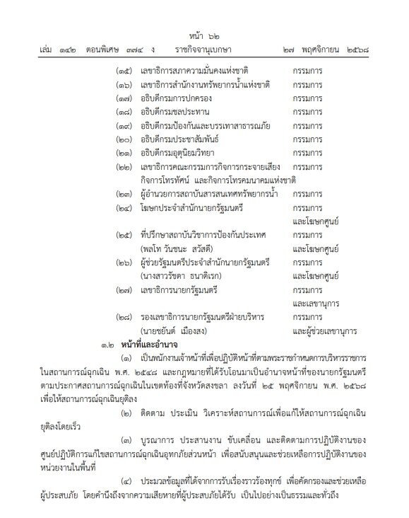 (1) เป็นพนักงานเจ้าหน้าที่เพื่อปฏิบัติหน้าที่ตามพระราชกำหนดการบริหารราชการในสถานการณ์ฉุกเฉิน พ.ศ. 2548 และกฎหมายที่ได้รับโอนมาเป็นอำนาจหน้าที่ของนายกรัฐมนตรี ตามประกาศสถานการณ์ฉุกเฉินในเขตท้องที่จังหวัดสงขลา ลงวันที่ 25 พฤศจิกายน พ.ศ. 2568 เพื่อให้สถานการณ์ฉุกเฉินยุติลง
