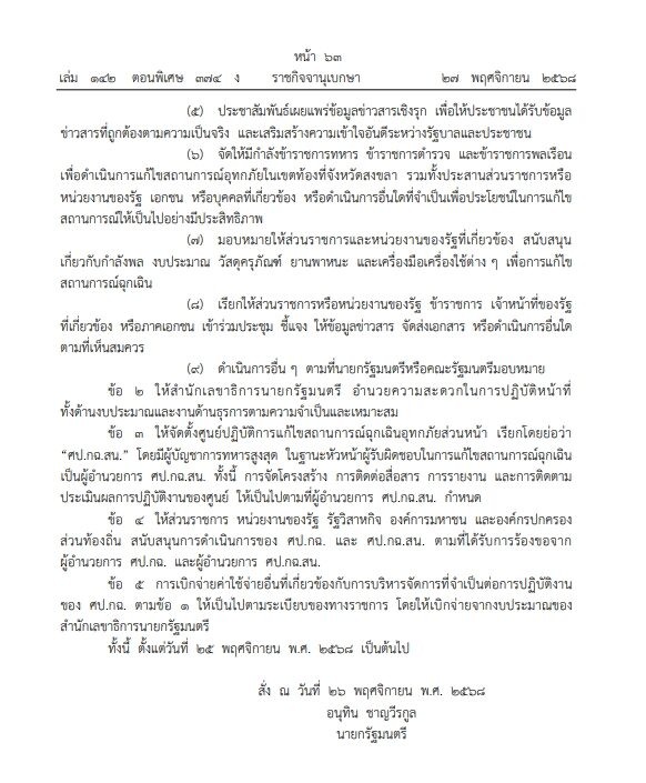 เพื่อให้การดำเนินการแก้ไขสถานการณ์ฉุกเฉินเป็นไปอย่างเหมาะสมและมีประสิทธิภาพ อาศัยอำนาจตามความในมาตรา 7 วรรคสาม และวรรคห้า แห่งพระราชกำหนดการบริหารราชการในสถานการณ์ฉุกเฉิน พ.ศ. 2548 และมติคณะรัฐมนตรีเมื่อวันที่ 25 พฤศจิกายน พ.ศ. 2568 นายกรัฐมนตรี จึงมีคำสั่ง ดังต่อไปนี้