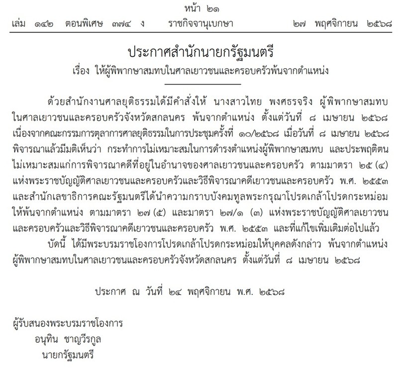 ด้วยสำนักงานศาลยุติธรรมได้มีคำสั่งให้ นางสาวไทย พงศธรจริง ผู้พิพากษาสมทบในศาลเยาวชนและครอบครัวจังหวัดสกลนคร พ้นจากตำแหน่งตั้งแต่วันที่ 8 เมษายน 2568 เนื่องจากคณะกรรมการตุลาการศาลยุติธรรมในการประชุมครั้งที่ 10/2568 เมื่อวันที่ 8 เมษายน 2568 พิจารณาแล้วมีมติเห็นว่า กระทำการไม่เหมาะสมในการดำรงตำแหน่งผู้พิพากษาสมทบ และประพฤติตนไม่เหมาะสมแก่การพิจารณาคดีที่อยู่ในอำนาจของศาลเยาวชนและครอบครัว ตามมาตรา 25(4) แห่ง พ.ร.บ.ศาลเยาวชนและครอบครัวและวิธีพิจารณาคดีเยาวชนและครอบครัว พ.ศ. 2553 แห่งสำนักเลขาธิการคณะรัฐมนตรี ได้นำความกราบบังคมทูลพระกรุณาโปรดเกล้าโปรดกระหม่อมให้พ้นจากตำแหน่ง ตามมาตรา 27 (5) และมาตรา 27/1 (3) แห่ง พ.ร.บ.ศาลเยาวชนและครอบครัวและวิธีพิจารณาคดีเยาวชนและครอบครัว พ.ศ. 2553 ที่แก้ไขเพิ่มเติมต่อไปแล้ว