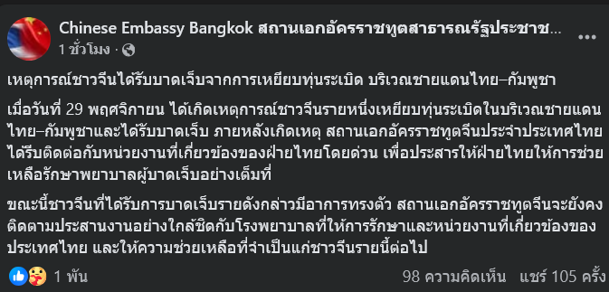 วันที่ 29 พฤศจิกายน 2568 มีรายงานว่า เพจเฟซบุ๊ก Chinese Embassy Bangkok สถานเอกอัครราชทูตสาธารณรัฐประชาชนจีนประจำประเทศไทย ได้โพสต์ข้อความระบุว่า เหตุการณ์ชาวจีนได้รับบาดเจ็บจากการเหยียบทุ่นระเบิด บริเวณชายแดนไทย–กัมพูชา