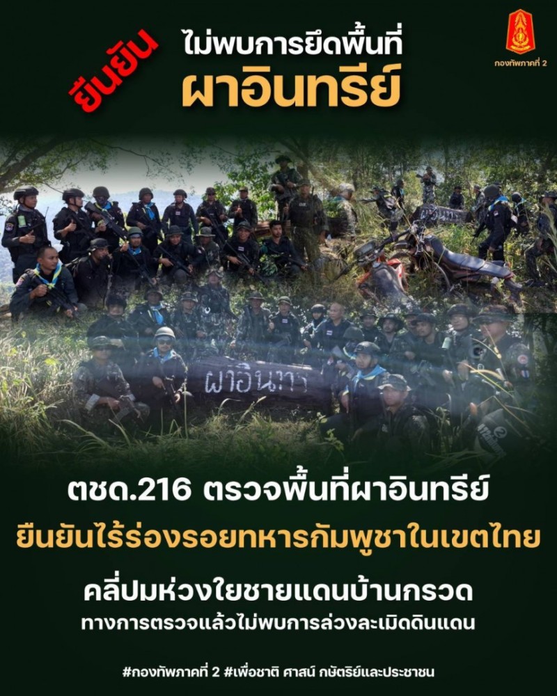 วันที่ 1 ธ.ค. 2568 กองทัพภาคที่ 2 ชี้แจงต่อสาธารณชนเกี่ยวกับกระแสข่าวที่ปรากฏในสื่อสังคมออนไลน์ กรณีมีกำลังทหารกัมพูชาเข้ามายึดพื้นที่บริเวณ "ผาอินทรีย์" อำเภอบ้านกรวล จังหวัดบุรีรัมย์ โดยขอยืนยันว่า หน่วยงานด้านความมั่นคงที่รับผิดชอบพื้นที่ ได้แก่ ตชต.216 และฝ่ายปกครองอำเภอบ้านกรวด ได้ลงพื้นที่ตรวจสอบข้อเท็จจริงในวันนี้ เวลา 10.00 น. โดยใช้รถจักรยานยนต์ในการเข้าถึงพื้นที่ เนื่องจากสภาพเส้นทางไม่สามารถใช้ยานยนต์ขนาดใหญ่ได้