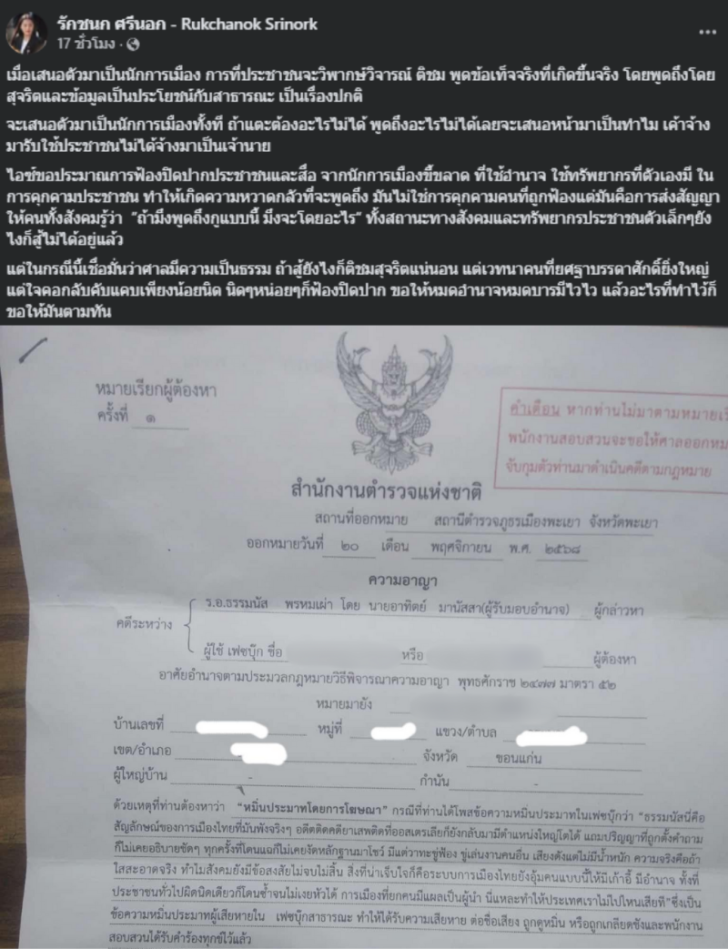 เมื่อวันที่ 2 ธันวาคม 2568 ไอซ์ รักชนก ศรีนอก ส.ส.กทม. พรรคประชาชน โพสต์ข้อความผ่านเฟซบุ๊ก รักชนก ศรีนอก - Rukchanok Srinork หลังแชร์โพสต์ของผู้ใช้เฟซบุ๊กรายหนึ่งที่ถูก ร.อ. ธรรมมัส พรมเผ่า ฟ้องหมิ่นประมาท โดยระบุว่าการวิพากษ์วิจารณ์นักการเมืองเป็นสิทธิ์ปกติของประชาชน