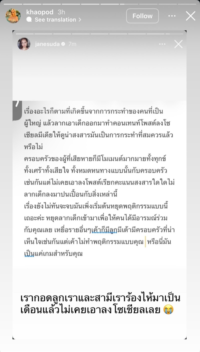 จากกรณี เจนสุดา ปานโต ได้ออกมาโพสต์ข้อความฟาดแรงผ่านไอจีสตอรี่ @janesuda แบบชัดถ้อยชัดคำ เพื่อตั้งคำถามถึงพฤติกรรมของผู้ใหญ่บางคนที่นำเด็กมาใช้เป็นส่วนหนึ่งของคอนเทนต์บนโซเชียลเพื่อเรียกความน่าสงสาร โดยระบุว่า เรื่องอะไรก็ตามที่เกิดขึ้นจากการกระทำของคนที่เป็น ผู้ใหญ่ แล้วลากเอาเด็กออกมาทำคอนเทนต์โพสต์ลงโซเชียลมีเดียให้ดูน่าสงสารมันเป็นการกระทำที่สมควรแล้ว หรือไม่