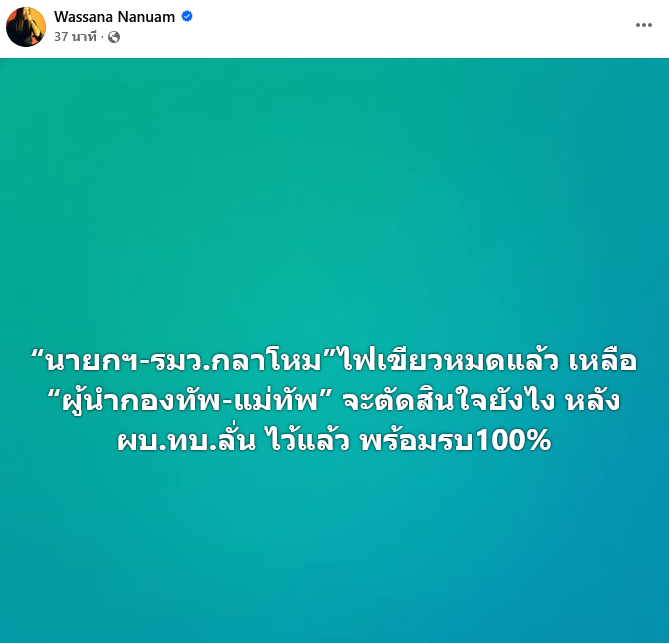 ล่าสุด ด้าน วาสนา นาน่วม ผู้สื่อข่าวสายทหารชื่อดัง ได้ออกมาโพสต์ข้อความ ผ่านเฟซบุ๊กส่วนตัว Wassana Nanuam โดยระบุว่า นายกฯ - รมว.กลาโหม ไฟเขียวหมดแล้ว เหลือ ผู้นำกองทัพ - แม่ทัพ จะตัดสินใจยังไง หลัง ผบ.ทบ.ลั่นไว้แล้ว พร้อมรบ 100%