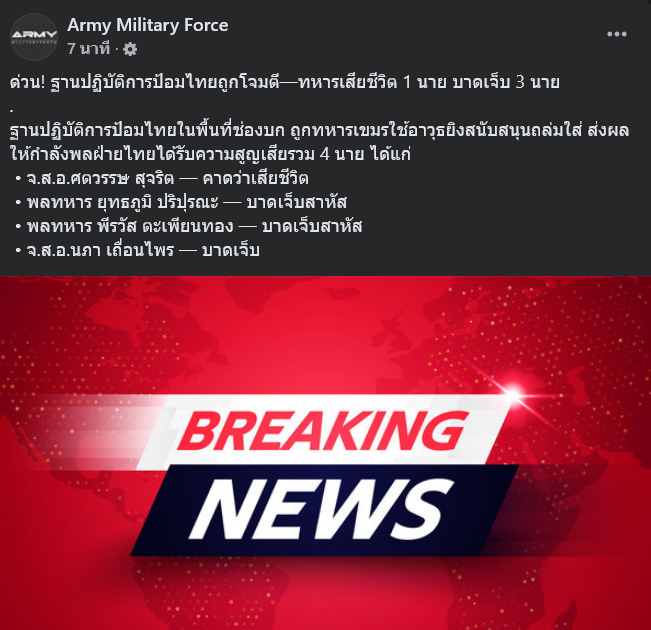 วันที่ 8 ธันวาคม 2568 Army Military Force รายงานว่า ด่วน! ฐานปฏิบัติการป้อมไทยถูกโจมตี—ทหารเสียชีวิต 1 นาย บาดเจ็บ 3 นาย