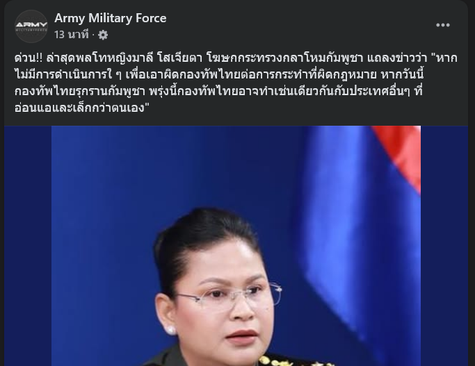 ล่าสุด เพจเฟซบุ๊ก Army Military Force รายงานระบุว่า ด่วน!! ล่าสุดพลโทหญิงมาลี โสเจียตา โฆษกกระทรวงกลาโหมกัมพูชา แถลงข่าวว่า หากไม่มีการดำเนินการใดๆ เพื่อเอาผิดกองทัพไทยต่อการกระทำที่ผิดกฎหมาย