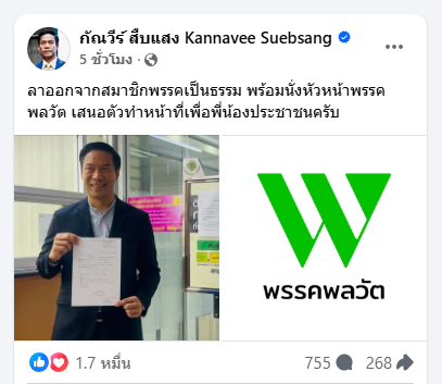 โดยเมื่อวันที่ 12 ธันวาคม นายกัณวีร์ สืบแสง ได้โพสต์ผ่านเพจเฟซบุ๊ก ส่วนตัว แจ้งว่าลาออกจากการเป็นสมาชิกพรรคเป็นธรรมแล้ว และประกาศรับตำแหน่งหัวหน้าพรรคพลวัต พร้อมเสนอตัวทำหน้าที่เพื่อประชาชนครับ