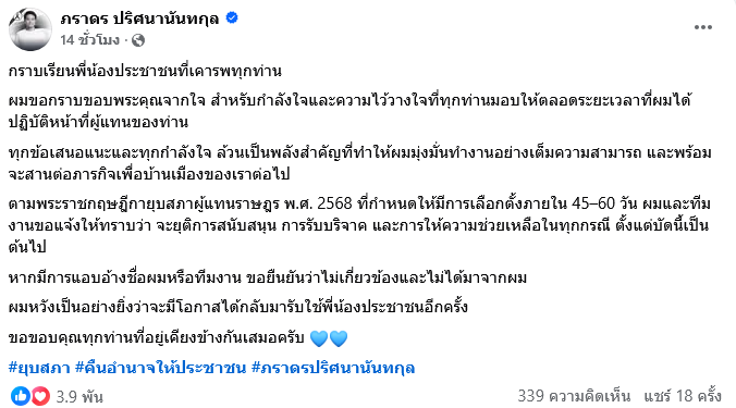 ล่าสุด ด้านนายภราดร ปริศนานันทกุล รัฐมนตรีประจำสำนักนายก ได้ออกมาเคลื่อนไหวอีกครั้ง หลังมีการประกาศยุบสภา โดยนายภราดรได้โพสต์ข้อความฝากถึงพี่น้องประชาชนทุกคน ผ่านเฟซบุ๊ก ภราดร ปริศนานันทกุล โดยระบุข้อความว่า กราบเรียนพี่น้องประชาชนที่เคารพทุกท่าน ผมขอกราบขอบพระคุณจากใจ สำหรับกำลังใจและความไว้วางใจที่ทุกท่านมอบให้ตลอดระยะเวลาที่ผมได้ปฏิบัติหน้าที่ผู้แทนของท่าน ทุกข้อเสนอแนะและทุกกำลังใจ ล้วนเป็นพลังสำคัญที่ทำให้ผมมุ่งมั่นทำงานอย่างเต็มความสามารถ และพร้อมจะสานต่อภารกิจเพื่อบ้านเมืองของเราต่อไป