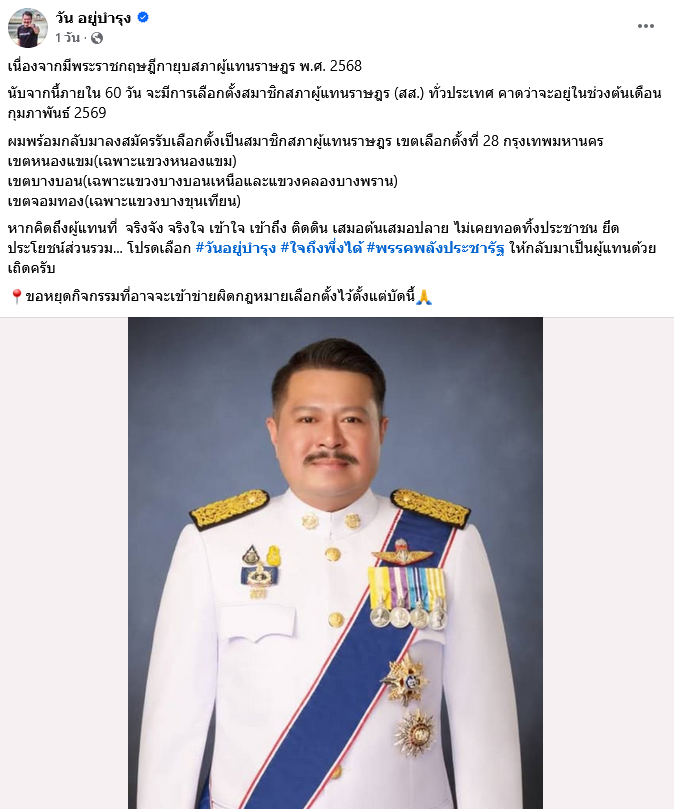 เมื่อวันที่ 12 ธันวาคม 2568 ที่ผ่านมา นายวัน อยู่บำรุง สมาชิกพรรคพลังประชารัฐ ได้โพสต์ข้อความผ่านเฟซบุ๊ก วัน อยู่บำรุง โดยระบุว่า เนื่องจากมีพระราชกฤษฎีกายุบสภาผู้แทนราษฎร พ.ศ. 2568 นับจากนี้ภายใน 60 วัน จะมีการเลือกตั้งสมาชิกสภาผู้แทนราษฎร (สส.) ทั่วประเทศ คาดว่าจะอยู่ในช่วงต้นเดือนกุมภาพันธ์ 2569