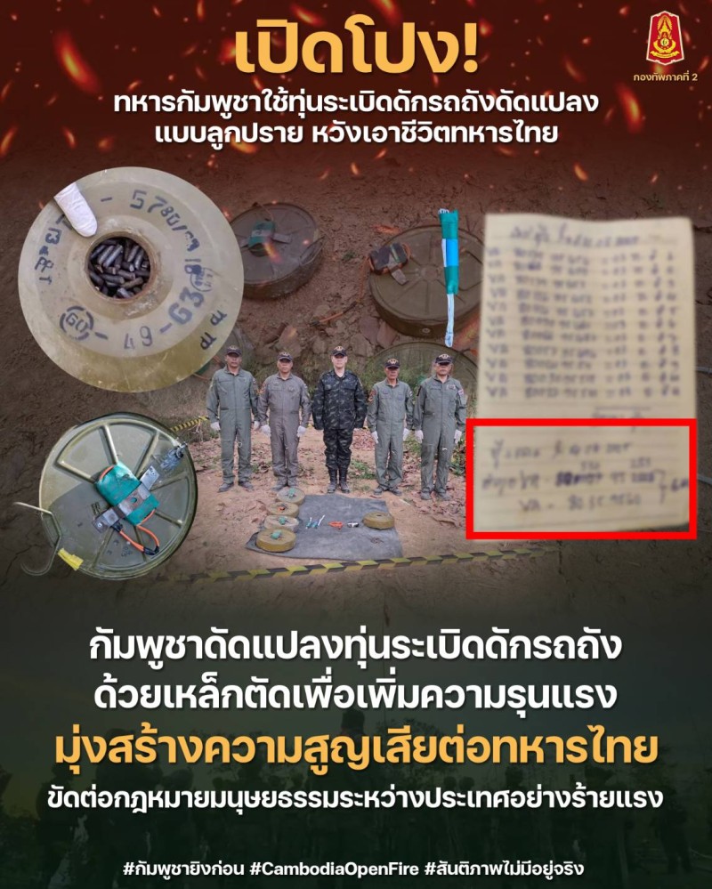 กัมพูชาดัดแปลงทุ่นระเบิดดักรถถัง ด้วยเหล็กตัดเพื่อเพิ่มความรุนแรง มุ่งสร้างความสูญเสียต่อทหารไทย ขัดต่อกฎหมายมนุษยธรรมระหว่างประเทศอย่างร้ายแรง
