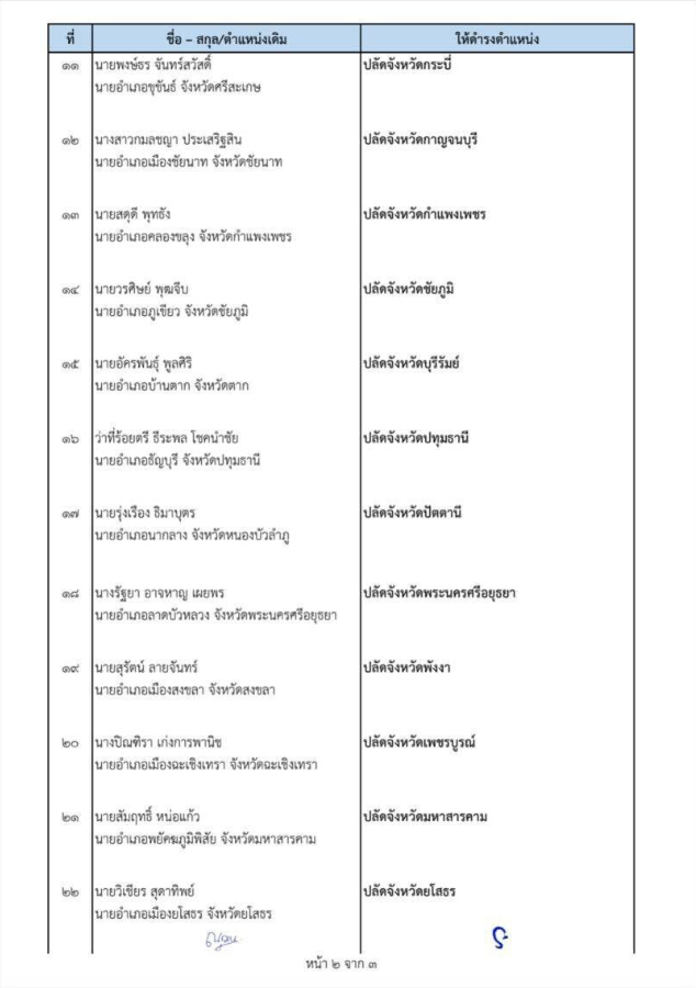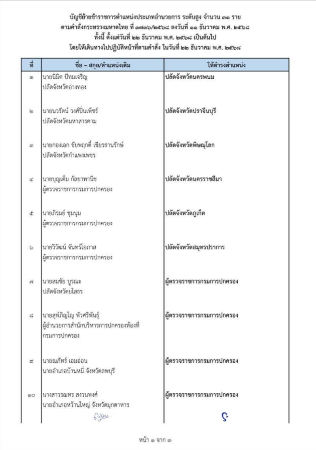 และที่แก้ไขเพิ่มเติม (ฉบับที่ 2) พ.ศ.2555 กฎ ก.พ. ว่าด้วยการให้ข้าราชการพลเรือนสามัญได้รับเงินประจำตำแหน่ง พ.ศ.2567 กฎ ก.พ. ว่าด้วยการย้ายการโอน หรือการเลื่อนข้าราชการพลเรือนสามัญไปแต่งตั้งให้ดำรงตำแหน่งข้าราชการพลเรือนสามัญตำแหน่งประเภทอำนวยการ ในหรือต่างกระทรวงหรือกรม พ.ศ. 2564 หนังสือสำนักงาน ก.พ. ที่ สร 0705/315 จึงให้ย้ายข้าราชการตำแหน่งประเภทอำนวยการ ระดับสูง จำนวน 31 รายดังบัญชีรายละเอียดแนบท้ายนี้ ทั้งนี้ ตั้งแต่วันที่ 22 ธ.ค. 2568 เป็นต้นไป น.ส.รณพร