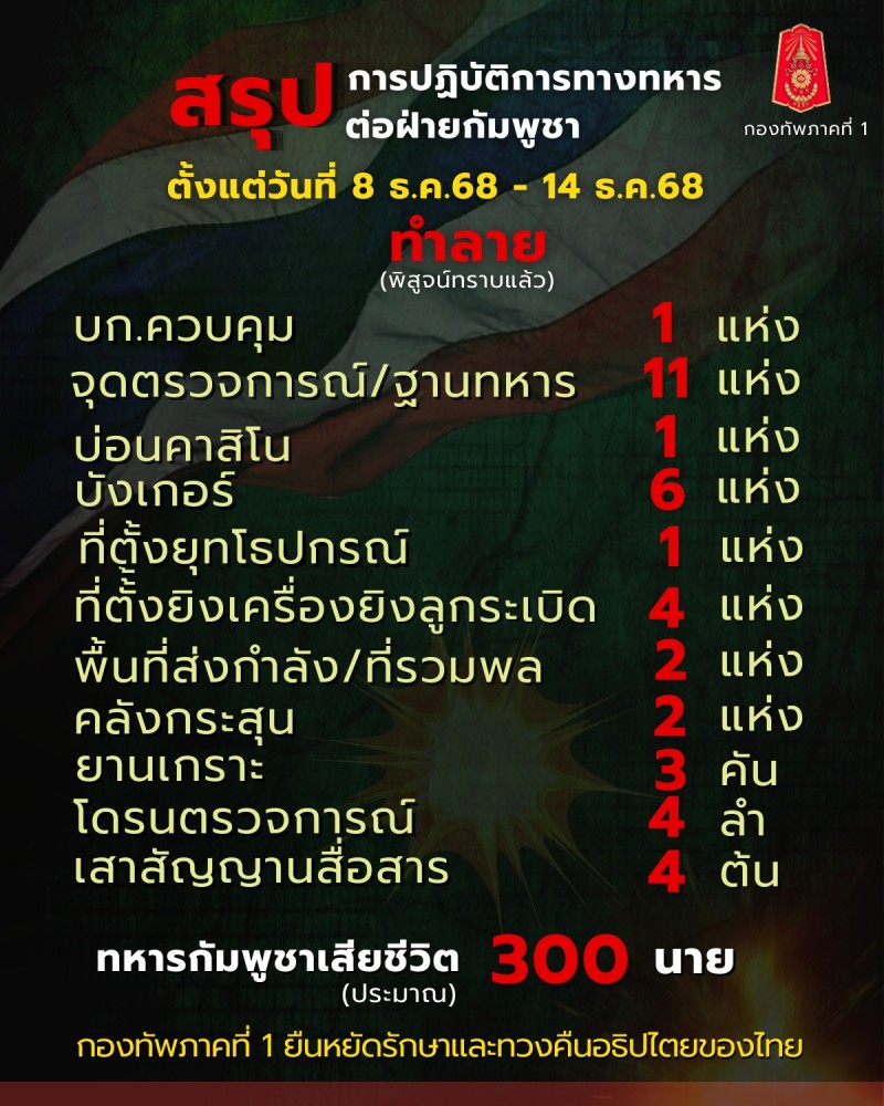 ทั้งนี้ กกล.บูรพา ได้ปฏิบัติการทางทหารต่อฝ่ายกัมพูชา ที่เป็นเป้าหมายทางทหารซึ่งถือเป็นภัยคุกคามต่ออธิปไตยของไทยและความปลอดภัยของทหารและประชาชน โดยสรุปความเสียหายของฝ่ายกัมพูชาที่พิสูจน์ทราบได้ ตั้งแต่ 8 ธ.ค.68 - ปัจจุบัน ได้แก่ บก.ควบคุม 1 แห่ง, จุดตรวจการณ์/ฐานทหาร 11 แห่ง, บ่อนคาสิโน 1 แห่ง, บังเกอร์ 6 แห่ง, ที่ตั้งยุทโธปกรณ์ 1 แห่ง, ที่ตั้งยิงเครื่องยิงลูกระเบิด 4 แห่ง, พื้นที่ส่งกำลัง/ที่รวมพล 2 แห่ง, คลังกระสุน 2 แห่ง, ยานเกราะ 3 คัน, โดรนตรวจการณ์ 4 ลำ, เสาสัญญาณสื่อสาร 4 ต้น และคาดว่าทหารกัมพูชาเสียชีวิตประมาณ 300 นาย