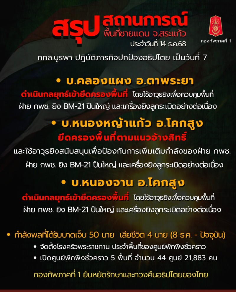 เมื่อวันที่ 14 ธันวาคม 2568 ศูนย์ประชาสัมพันธ์กองทัพภาคที่ 1 รายงานสรุปสถานการณ์ชายแดนไทย - กัมพูชา พื้นที่ จ.สระแก้ว ประจำวัน 14 ธันวาคม 2568 เวลา 18.00 น. ผ่านเพจเฟซบุ๊กทางการ กองทัพภาคที่ 1 โดยระบุว่า กกล.บูรพา ปฏิบัติภารกิจปกป้องอธิปไตยในสถานการณ์ความขัดแย้งไทย - กัมพูชา เป็นวันที่ 7 โดยมีการปฏิบัติที่สำคัญดังนี้