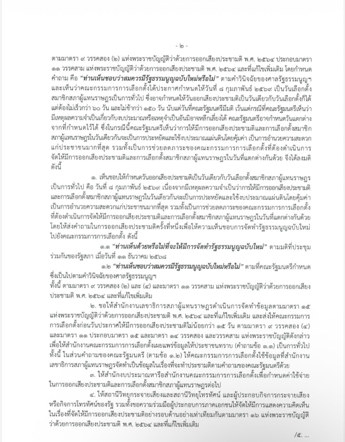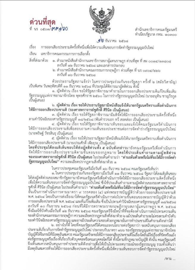 วันที่ 17 ธ.ค. 2568 เมื่อวันที่ 16 ธ.ค. ที่ผ่านมา นางณัฐฏ์จารี อนันตศิลป์ เลขาธิการคณะรัฐมนตรี (ครม.) ได้ทำหนังสือด่วนที่สุดถึงถึงเลขาธิการคณะกรรมการการเลือกตั้ง (กกต.) เรื่องการออกเสียงประชามติครั้งที่หนึ่ง เพื่อให้ความเห็นชอบการจัดทำรัฐธรรมนูญฉบับใหม่ โดยมีสาระสำคัญ เนื่องจาก ครม.ได้เห็นชอบให้กำหนดวันออกเสียงประชามติเป็นวันเดียวกับวันเลือกตั้งสมาชิกสภาผู้แทนราษฎรเป็นการทั่วไป คือ วันที่ 8 ก.พ. 2569 เนื่องจากมีเหตุผลความจำเป็นว่าการให้มีการออกเสียงประชามติและการเลือกตั้งสมาชิกสภาผู้แทนราษฎรในวันเดียวกันจะเป็นการประหยัดและใช้งบประมาณแผ่นดินโดยคุ้มค่าเป็นการอำนวยความสะดวกแก่ประชาชนมากที่สุด