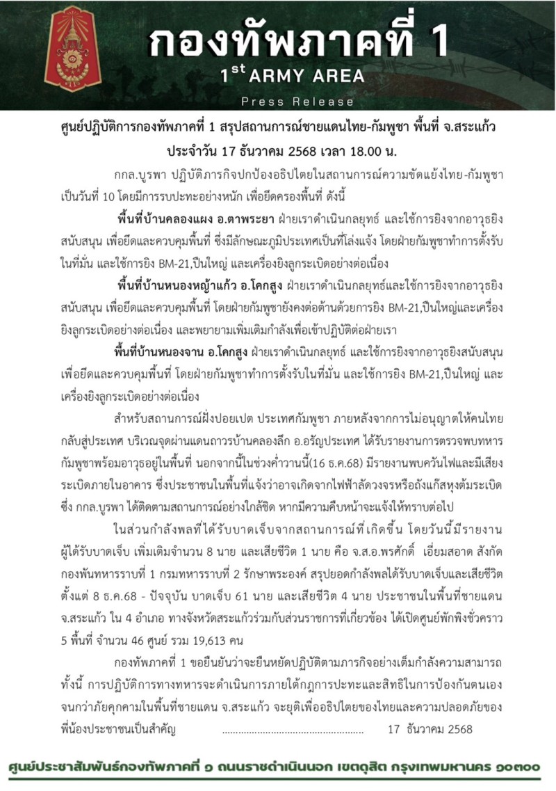กองทัพภาคที่ 1 ขอยืนยันว่าจะยืนหยัดปฏิบัติตามภารกิจอย่างเต็มกำลังความสามารถ ทั้งนี้ การปฏิบัติการทางทหารจะดำเนินการภายใต้กฎการปะทะและสิทธิในการป้องกันตนเอง จนกว่าภัยคุกคามในพื้นที่ชายแดน จ.สระแก้ว จะยุติเพื่ออธิปไตยของไทยและความปลอดภัยของพี่น้องประชาชนเป็นสำคัญ