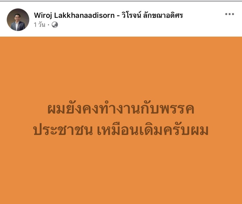 ด้านนายวิโรจน์ ลักขณาอดิศร ได้ออกมาเคลื่อนไหวด้วยการโพสต์ข้อความ ผ่านเพจเฟซบุ๊กส่วนตัว วิโรจน์ ลักขณาอดิศร โดยระบุสั้นเพียงว่า ผมยังคงทำงานกับพรรคประชาชน เหมือนเดิมครับผม