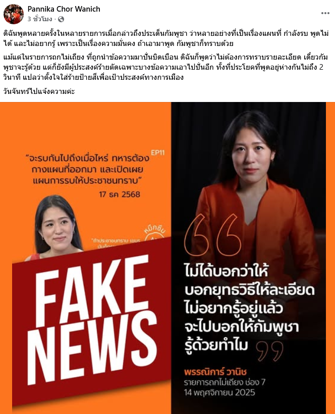 จากกรณีเมื่อเช้าของวันนี้ (20 ธันวาคม 2568) น.ส.พรรณิการ์ วานิช หรือ ช่อ แกนนำคณะก้าวหน้า ได้ออกมาเคลื่อนไหวถึงกรณีอ้างว่ามีการเผยแพร่ข้อความในทำนองที่บิดเบือน ในกลุ่มไอโอทหาร และฝ่ายอนุรักษ์นิยม ตามที่ได้รายงานไปนั้น