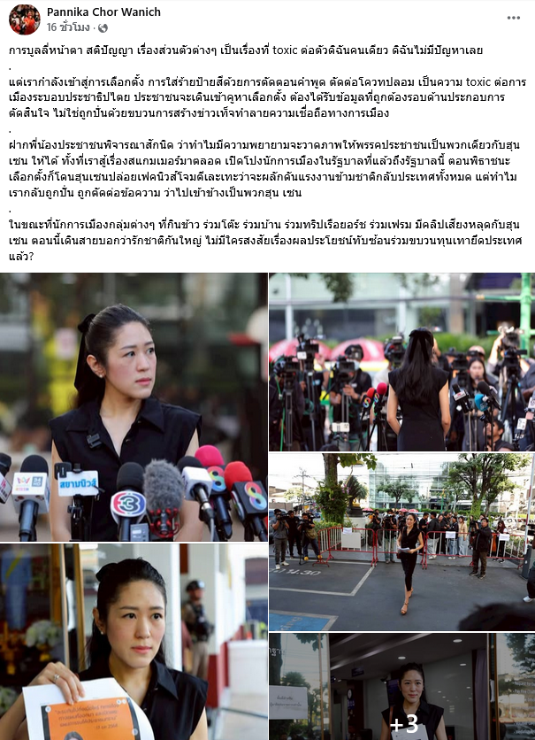 เมื่อวันที่ 23 ธันวาคม 2568 มีรายงานว่า นางสาวพรรณิการ์ วานิช หรือ ช่อ กรรมการบริหารคณะก้าวหน้า ได้ออกมาเคลื่อไหวอีกครั้งภายหลังเจ้าตัวได้เข้าเเจ้งความที่ สน.ทองหล่อ วานนี้ กรณีมีการอ้างว่าถูกบิดเบือนข้อมูล สร้างข่าวเท็จทำลายความเชื่อถือทางการเมือง ทั้งนี้ เจ้าตัวได้ออกมาโพสต์รูปภาพพร้อมข้อความผ่านเฟซบุ๊ก Pannika Chor Wanich โดยระบุว่า การบูลลี่หน้าตา สติปัญญา เรื่องส่วนตัวต่างๆ เป็นเรื่องที่ toxic ต่อตัวดิฉันคนเดียว ดิฉันไม่มีปัญหาเลย